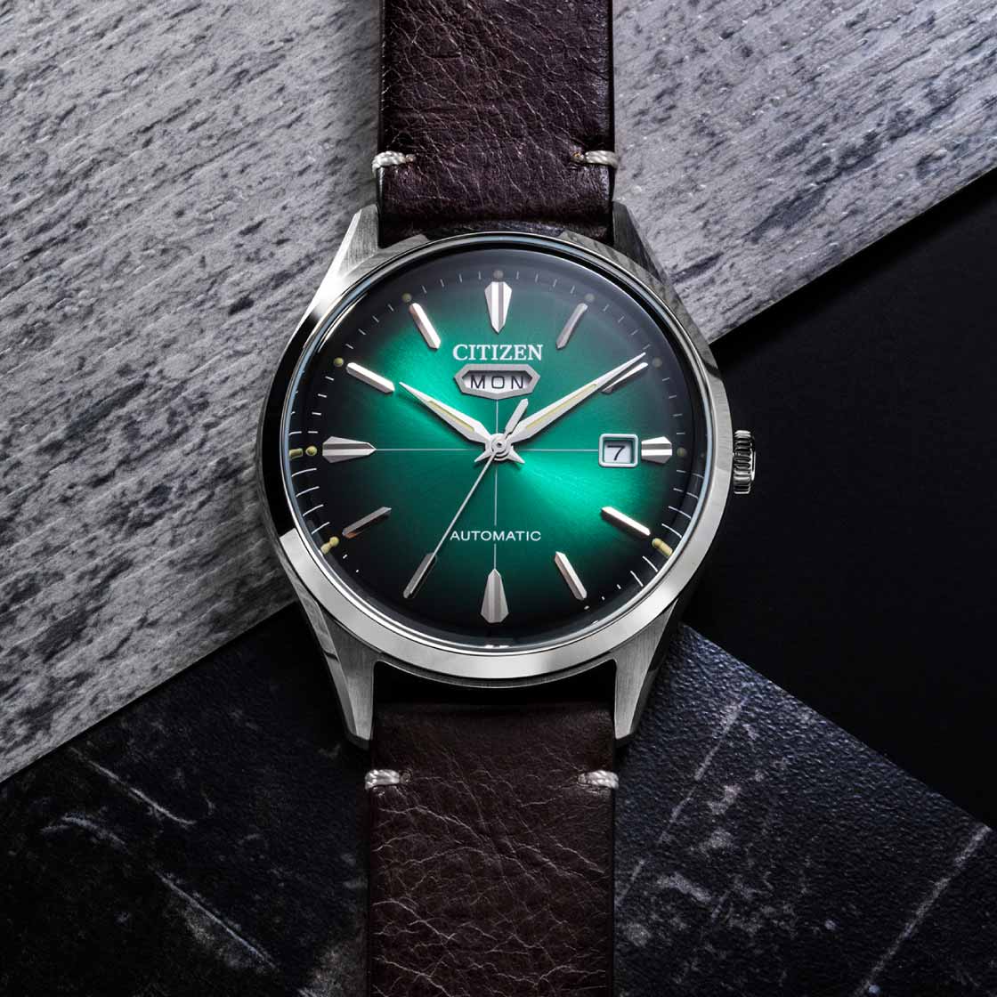 Ανδρικο αυτόματο ρολόί CITIZEN τυπου vintage με δερμάτινο λουράκι και πράσινο καντράν