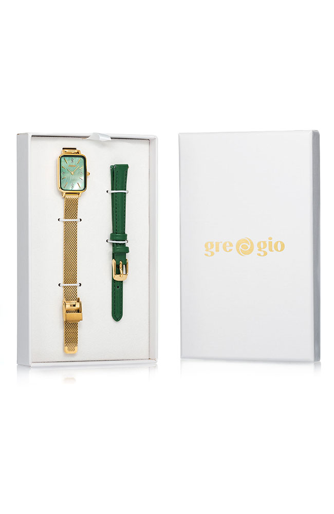 Γυναικείο ρολόι Gregio από ανοξείδωτο ατσάλι με πράσινο καντράν και μπρασελέ. Σε ειδική συσκευασία που περιέχει ένα επιπλέον δερμάτινο λουράκι.