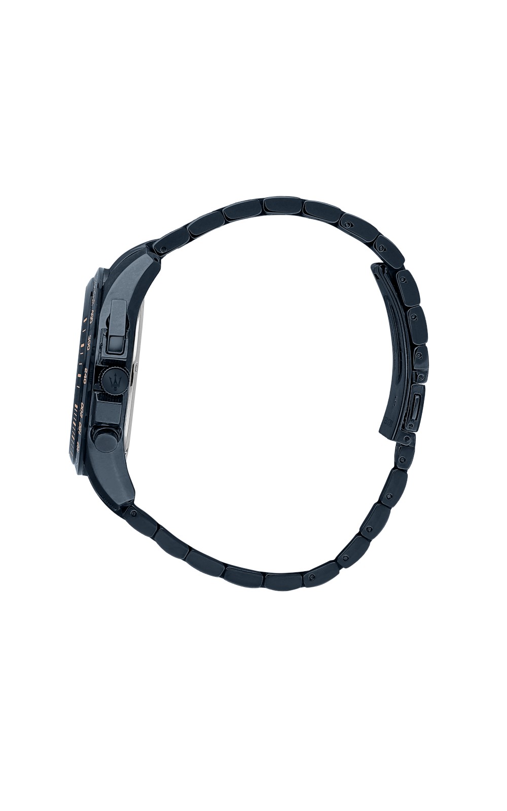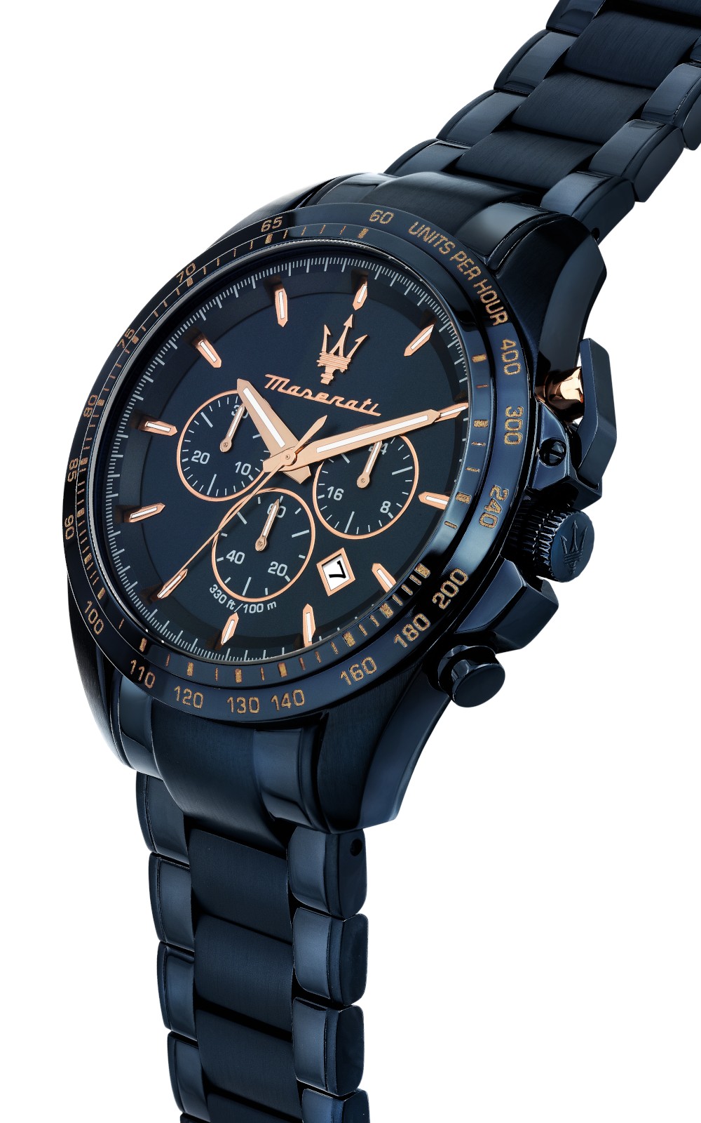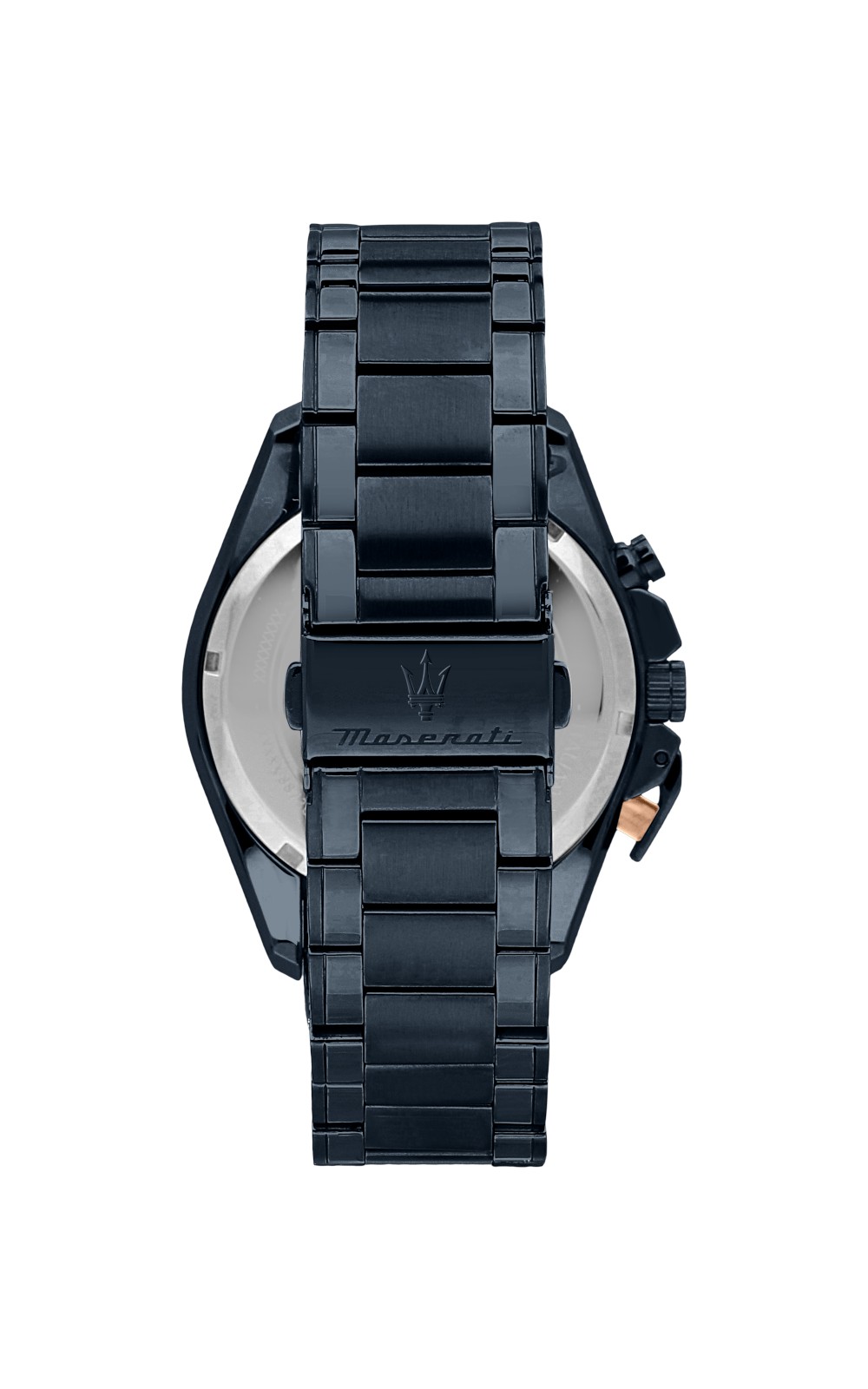 Ανδρικό ρολόι διαμέτρου 45mm, με μηχανισμό Quartz χρονογράφου ακριβείας. Έχει μπλε καντράν με ροζ επίχρυσους δείκτες, λεπτομέρειες και ένδειξη ημερομηνίας. Η κάσα του είναι μπλε χρώματος από ανοξείδωτο ατσάλι με κρύσταλλο από ορυκτό κρύσταλλο ειδικής σκλήρυνσης. Έχει μπλε μπρασελέ από ανοξείδωτο ατσάλι με κούμπωμα ασφαλείας. Είναι αδιάβροχο (10 ATM). Συνοδεύεται από κουτί συσκευασίας MASERATI και ΕΓΓΥΗΣΗ 2 ΕΤΩΝ της επίσημης αντιπροσωπείας MASERATI.