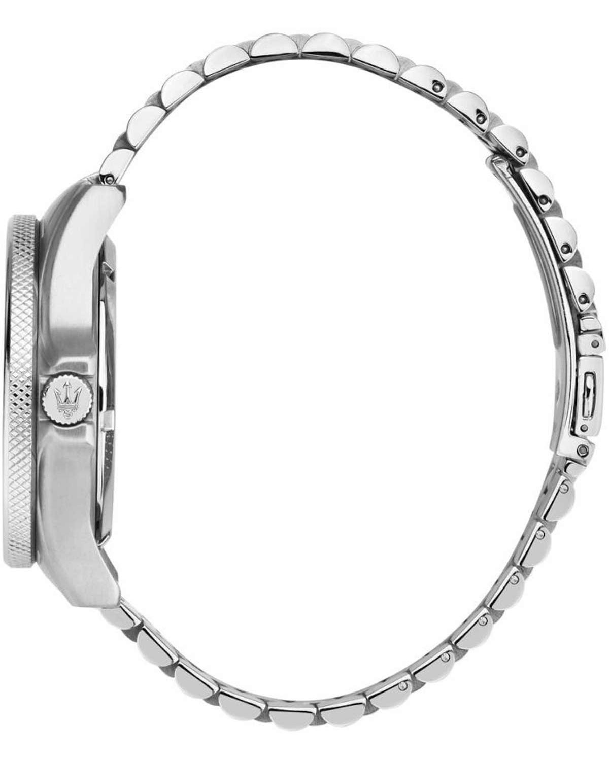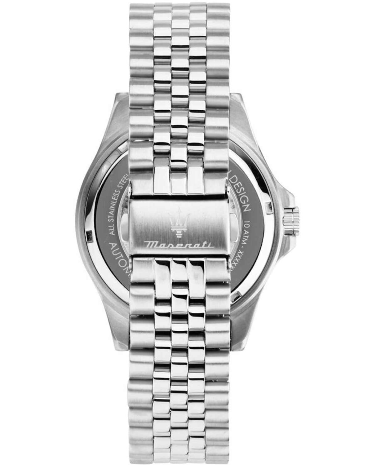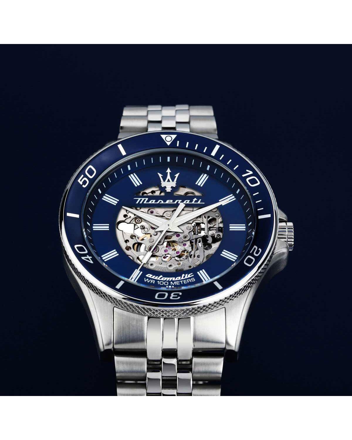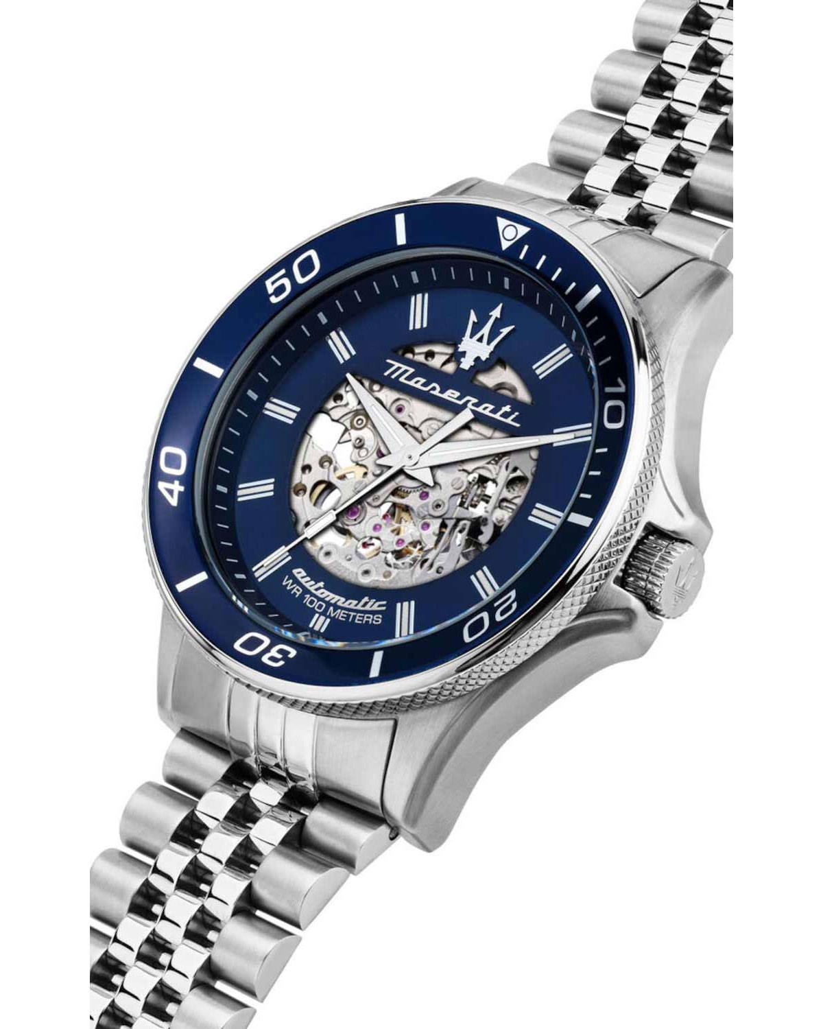 Ανδρικό ρολόι MASERATI SFIDA διαμέτρου 44mm, με αυτόματο μηχανισμό, μπλε καντράν με εμφανή μηχανισμό, κάσα και μπρασελέ από ανοξείδωτο ατσάλι.