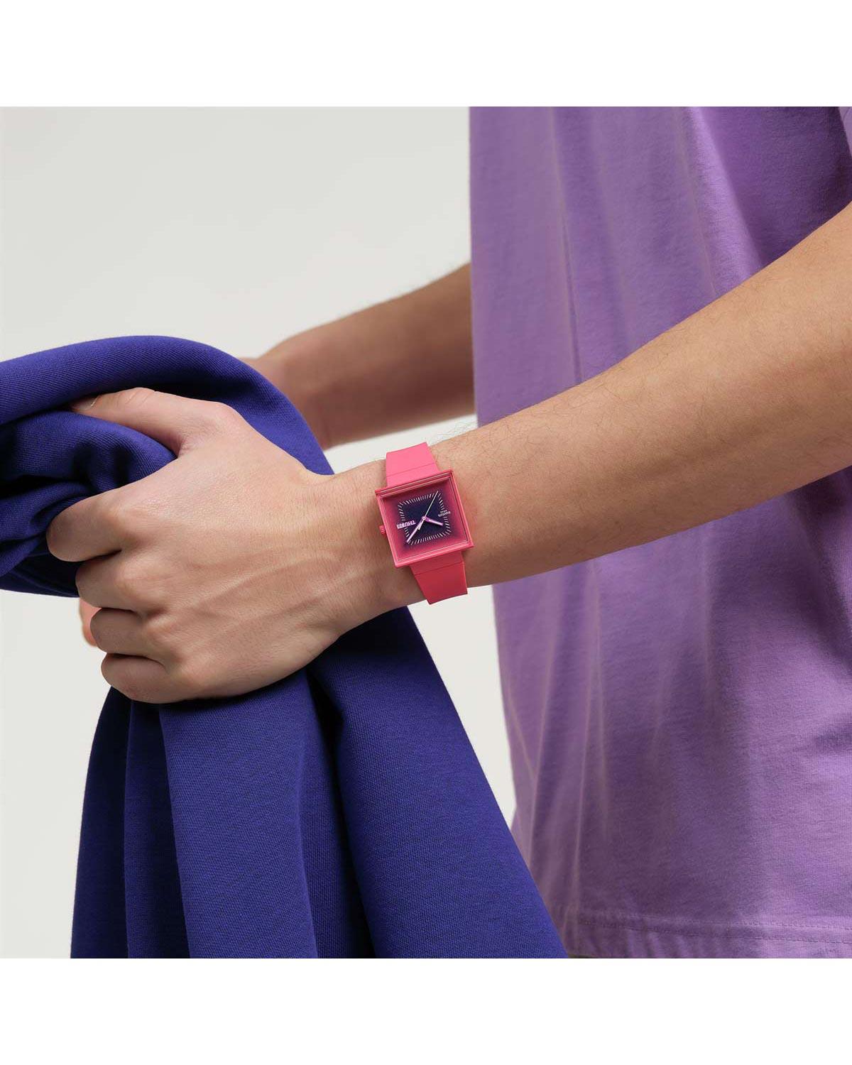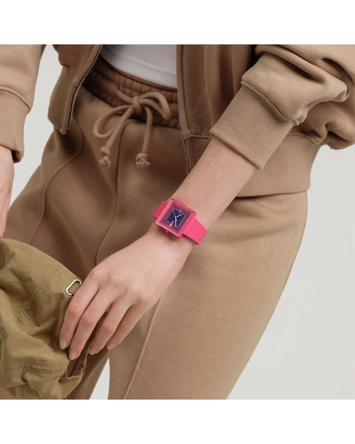 SWATCH Essentials Squarely Berry Two Tone Silicone Strap SO34R700. Η τετράγωνη σκούρα ροζ ματ Bioceramic κάσα του ρολογιού διαθέτει τζάμι βιολογικής προέλευσης από άκρου σε άκρο που επιτρέπει να φαίνεται από το πλάι η τυπωμένη ζώνη ενδείξεων λεπτών σε ανοιχτό ροζ χρώμα.