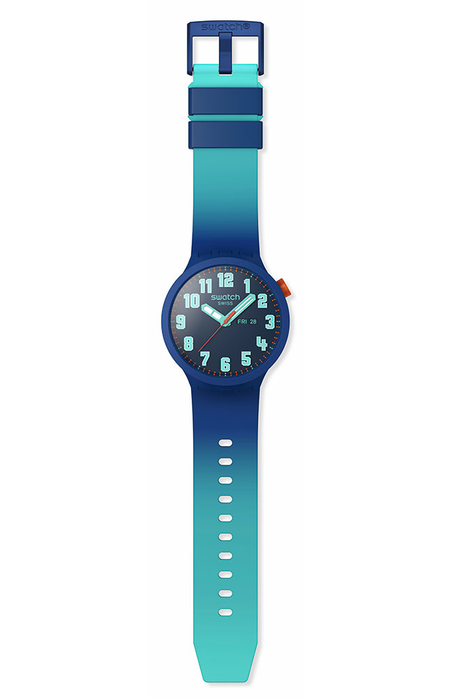 Αυτό το μεγάλου μεγέθους ρολόι ξεχωρίζει χάρη στο σκούρο μπλε καντράν με τους τρισδιάστατους τιρκουάζ αριθμούς, την τιρκουάζ και κόκκινη τυπωμένη ζώνη ενδείξεων λεπτών και τη σκούρα μπλε ένδειξη ημέρας/ημερομηνίας με την τιρκουάζ εκτύπωση στη θέση της ώρας 3.