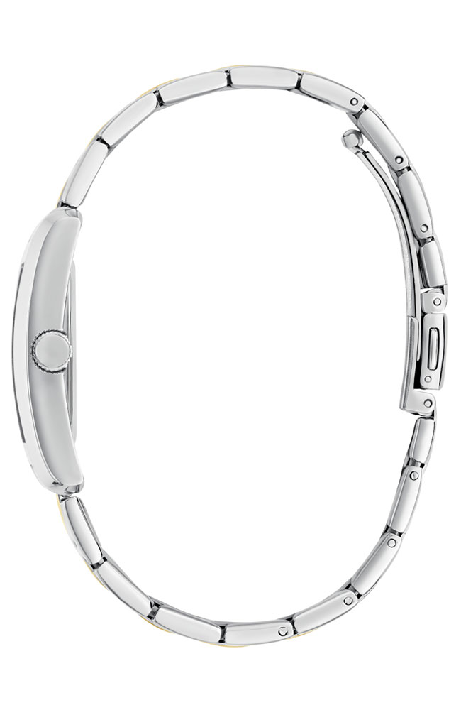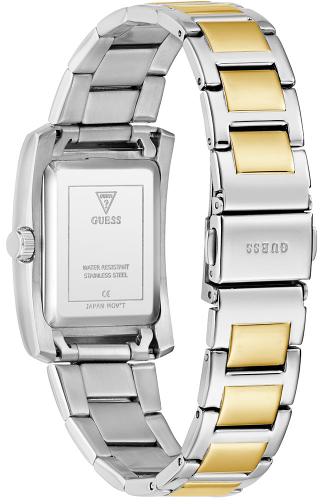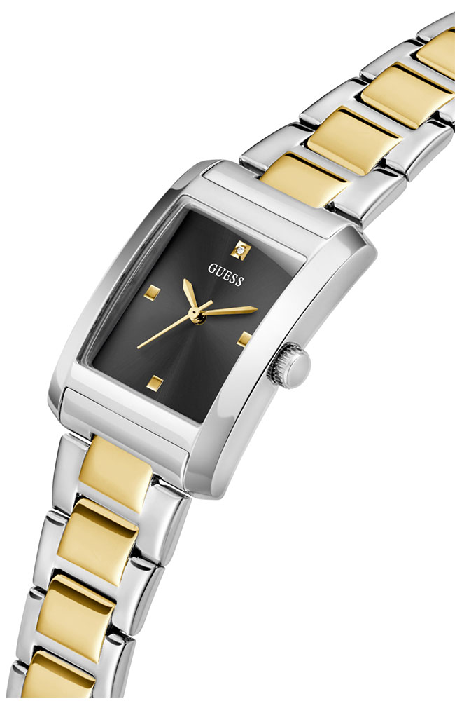 Γυναικείο ρολόι Guess από ανοξείδωτο ατσάλι με μαύρο καντράν, πέτρα Ζιργκόν και δίχρωμο μπρασελέ.