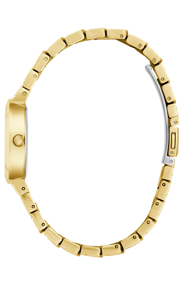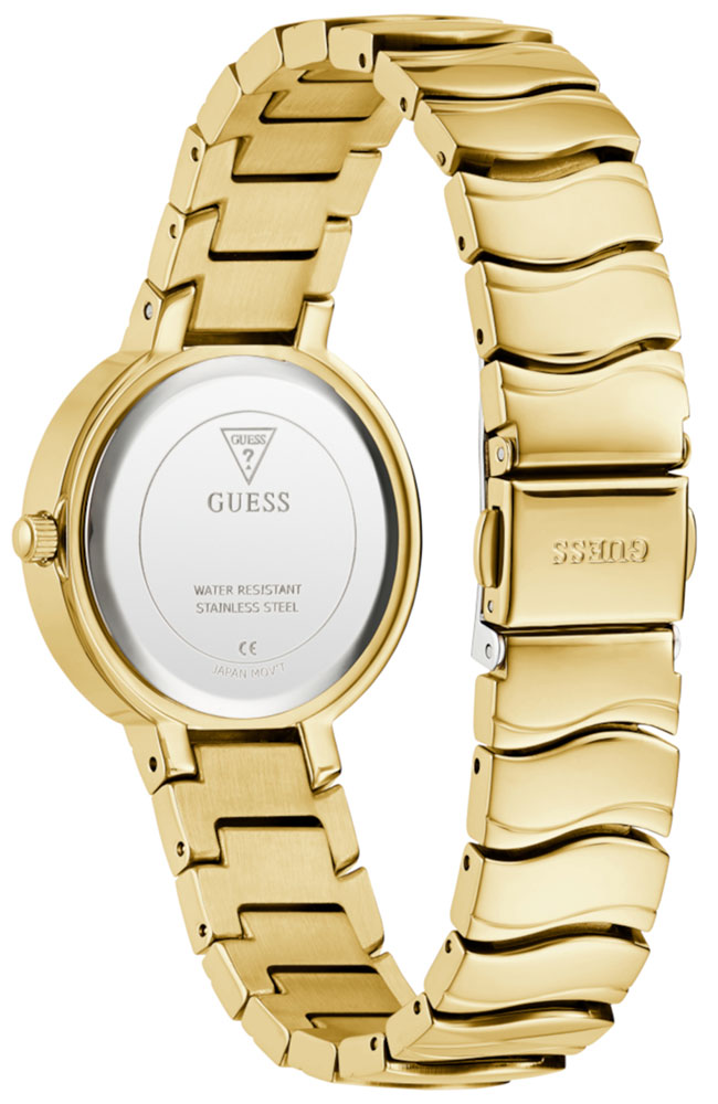 Γυναικείο ρολόι Guess από ανοξείδωτο επίχρυσο ατσάλι με γαλάζιο καντράν και μπρασελέ.
