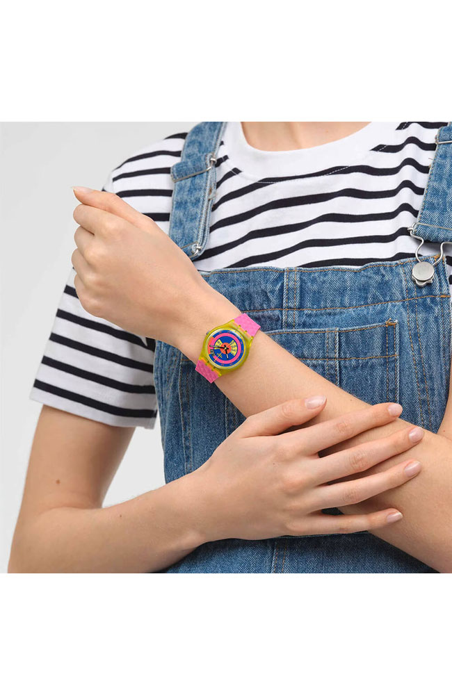 Αυτό το ζωηρόχρωμο ρετρό ρολόι εμπνέεται από ένα ρολόι Swatch της δεκαετίας του ‘90: το SKYCHART GN705. Το πολύχρωμο neon καντράν του είναι τοποθετημένο σε διάφανη κίτρινη κάσα βιολογικής προέλευσης. Ένα hot pink λουράκι και ένα διάφανο κίτρινο κούμπωμα συμπληρώνουν το neon look αυτού του vintage Swatch.