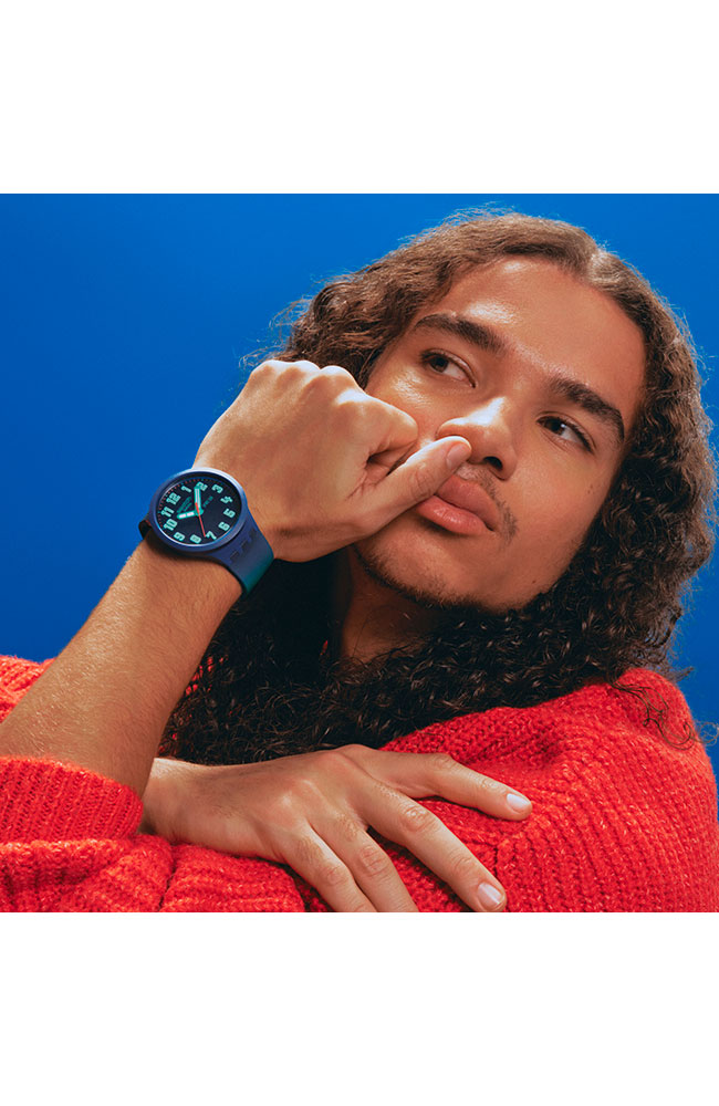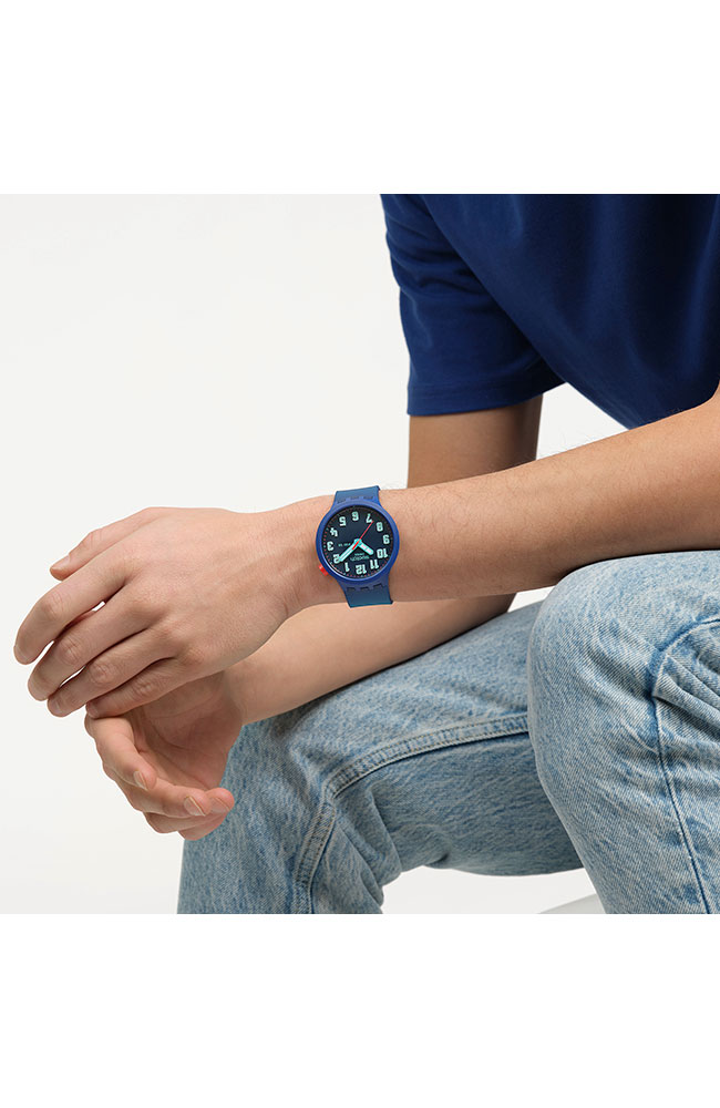 Αυτό το μεγάλου μεγέθους ρολόι ξεχωρίζει χάρη στο σκούρο μπλε καντράν με τους τρισδιάστατους τιρκουάζ αριθμούς, την τιρκουάζ και κόκκινη τυπωμένη ζώνη ενδείξεων λεπτών και τη σκούρα μπλε ένδειξη ημέρας/ημερομηνίας με την τιρκουάζ εκτύπωση στη θέση της ώρας 3.
