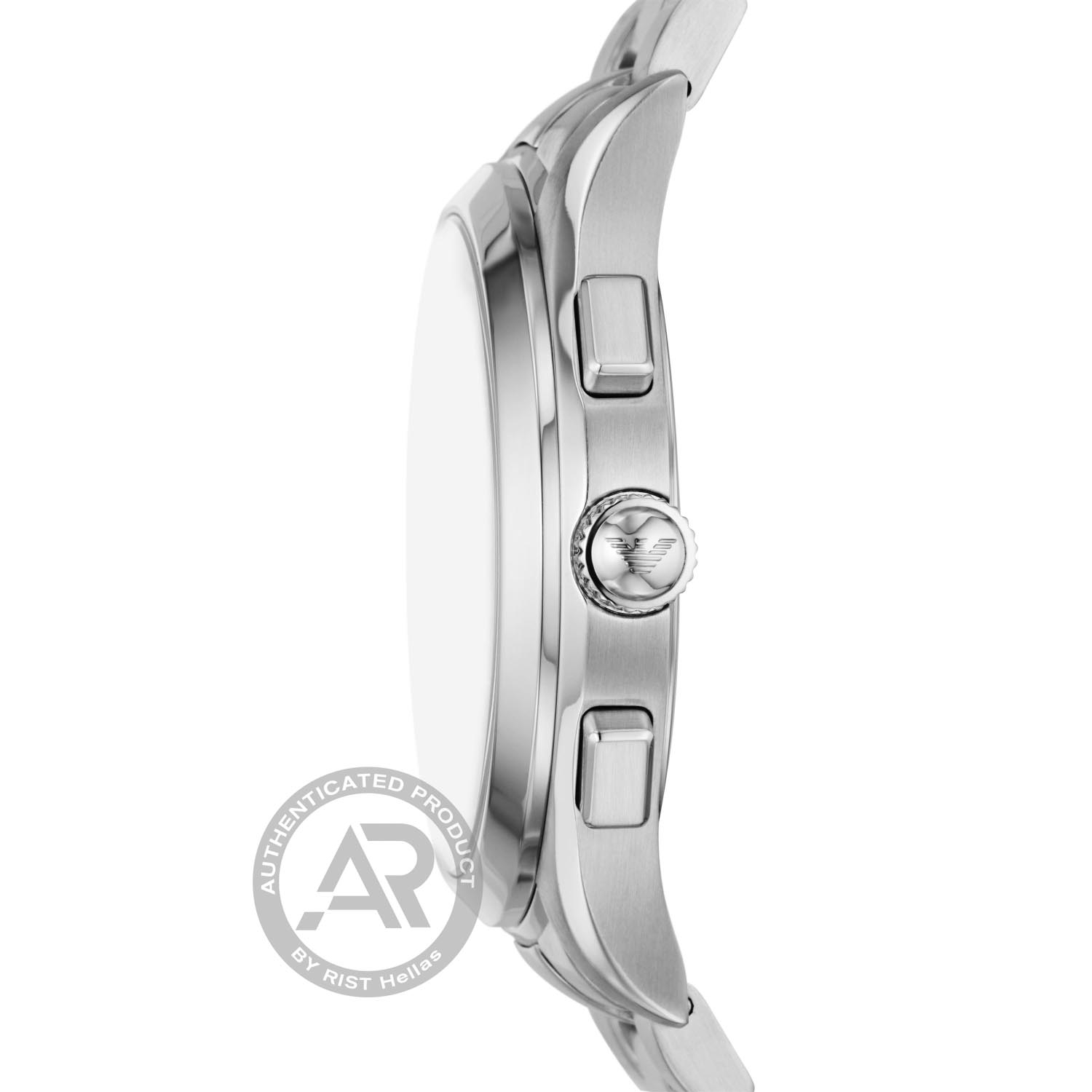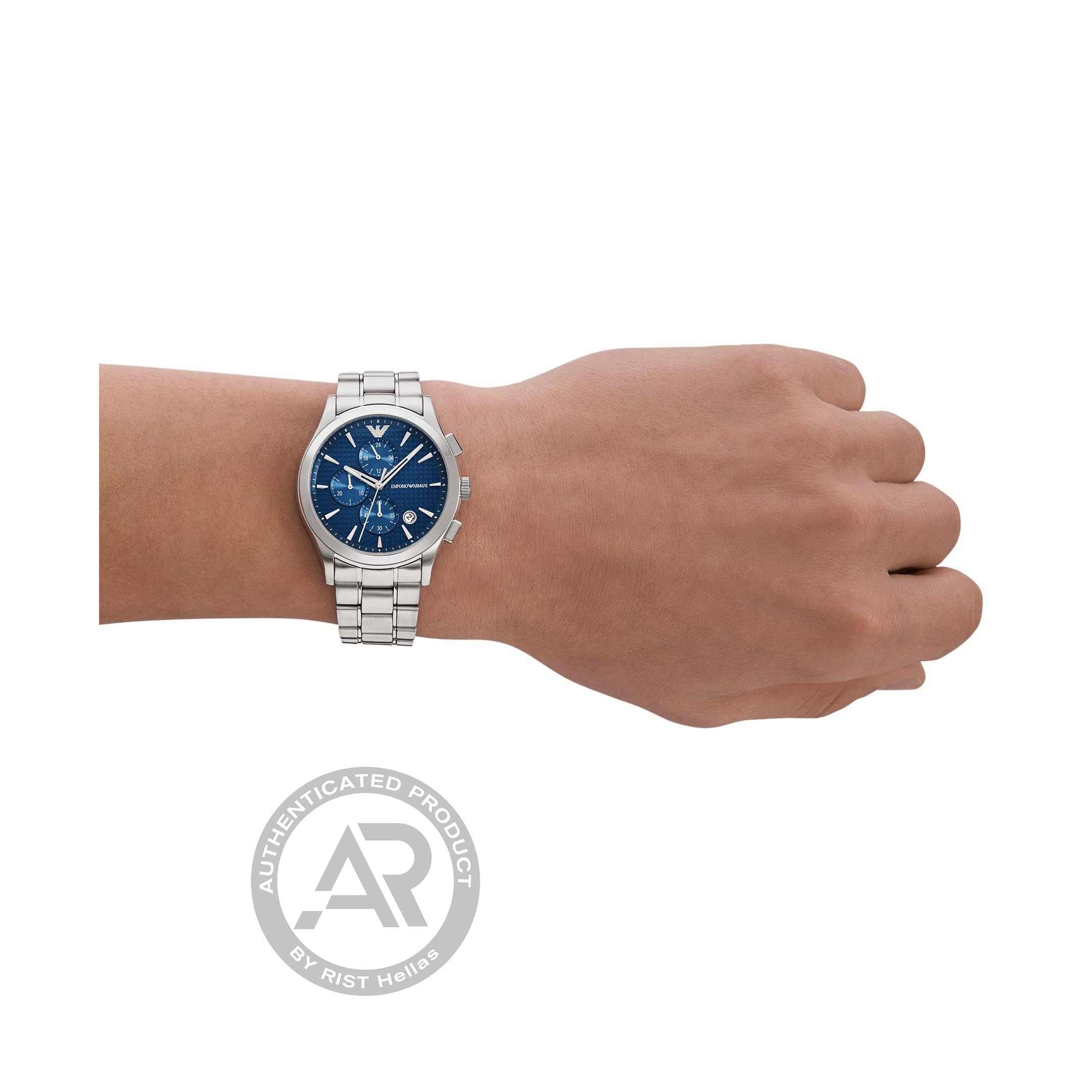 Ατσάλινο ρολόι EMPORIO ARMANΙ με μπλε πλάκα και χρονογράφο.