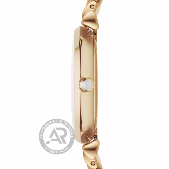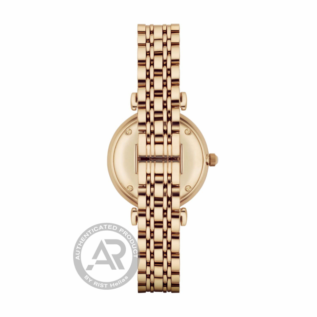 Η θέρμη του χρυσού σε συνδυασμό με το λευκό φίλντισι καντράν υπογραμμίζουν το σοφιστικέ και retro style της συλλογής Emporio Armani. Κερδίζει το κοινό χάρη στην απέριττη κομψότητά του και τη χαρακτηριστική κάσα T-Bar με τα ιδιαίτερα lugs που ενώνουν την κάσα με το επιχρυσωμένο μπρασελέ. Tο εντυπωσιακό καντράν διακοσμημένο με λαμπερά κρύσταλλα δίνει άμεσα την αίσθηση της πολυτέλειας.