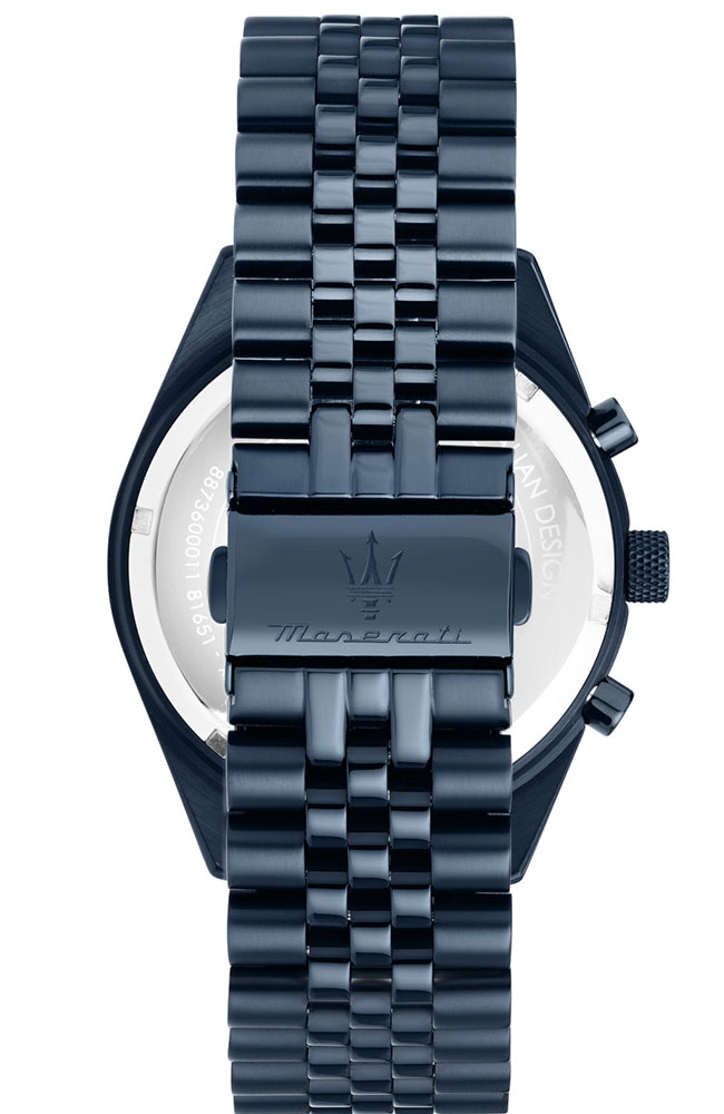 Ανδρικό ρολόι MASERATI BLUE EDITION R8873600011 διαμέτρου 43mm, με μηχανισμό Quartz χρονογράφος ακριβείας, μπλε καντράν, κάσα και μπρασελέ από ανοξείδωτο ατσάλι.