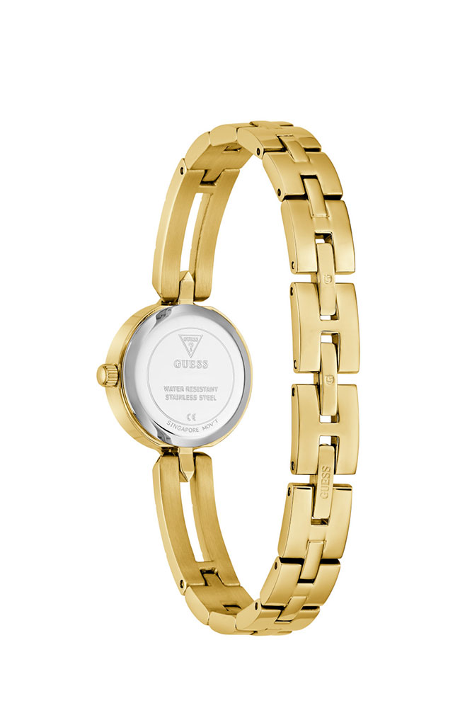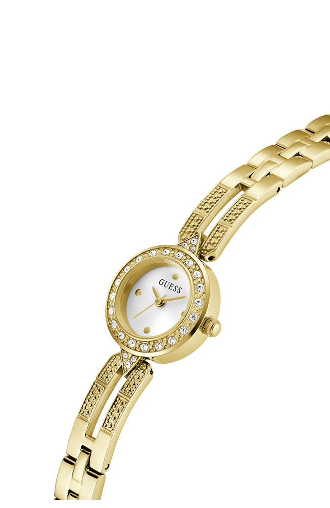 Γυναικείο ρολόι Guess από ανοξείδωτο ατσάλι με ασημί καντράν, πέτρες ζιργκόν και μπρασελέ.