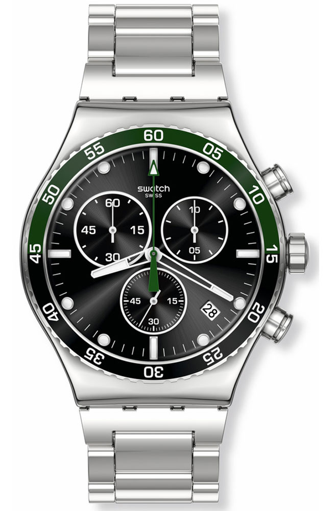 SWATCH Dark Green Irony Chronograph Silver Stainless Steel Bracelet YVS506G